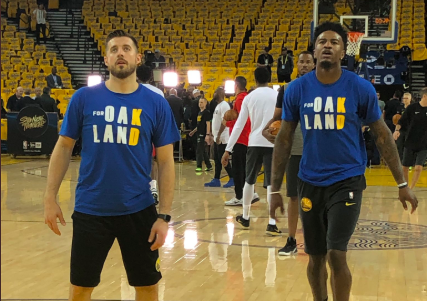 根據The Athletic記者Sam Amick報道,勇士在本場比賽前,特別訂做了印有“為了奧克蘭”字樣的球員熱身T-恤衫和毛巾(見新聞配圖),并為了支持此前受傷的球隊前鋒凱文-杜蘭特,特意將KD兩個字母印在最后,可以看作是“為了奧克蘭,為了KD”。